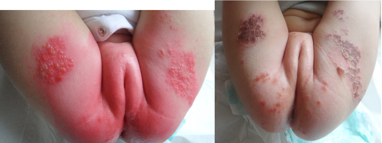 - Quand il y a surinfection bactérienne (microbienne), il vient s’ajouter des pustules (petites « cloches » contenant un liquide trouble) et des érosions cutanées qui peuvent donner lieu à des ulcérations. Il y a impétiginisation. « La peau est à vif ». Il se forme des croûtes. Les creux inguinaux, le périnée et le pli inter-fessier sont envahis.