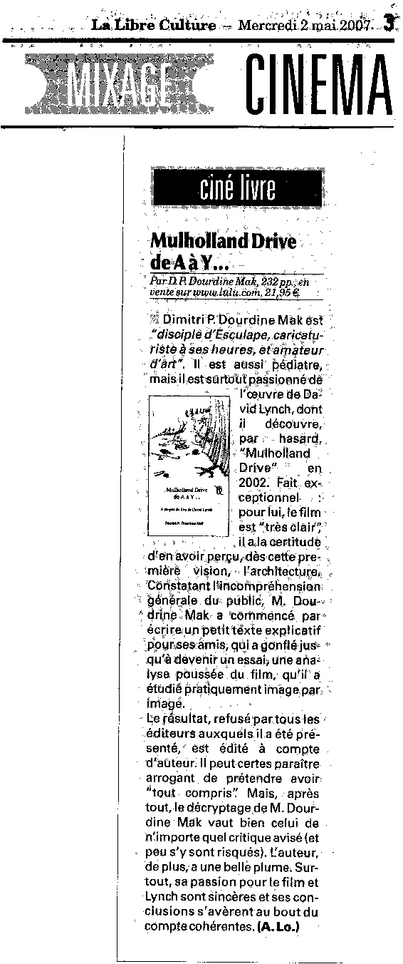 Le résultat, refusé par tous les éditeurs auxquels il a été présenté, est édité à compte d’auteur. Il peut certes paraître arrogant de prétendre avoir « tout compris ». Mais, après tout, le décryptage de M. Dourdine Mak vaut bien celui de n’importe quel critique avisé (et peu s’y sont risqués). L’auteur, de plus, a une belle plume. Surtout, sa passion pour le film et Lynch sont sincères et ses conclusions s’avèrent au bout du compte cohérentes.